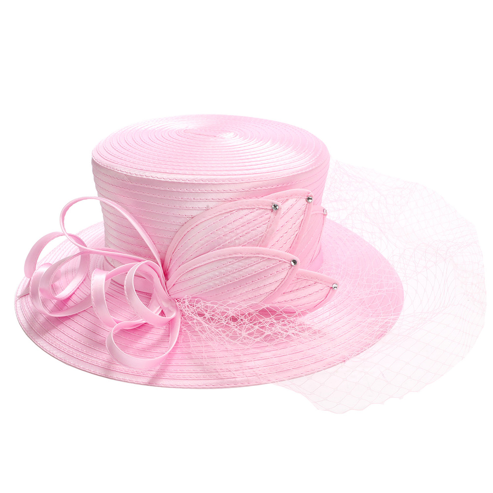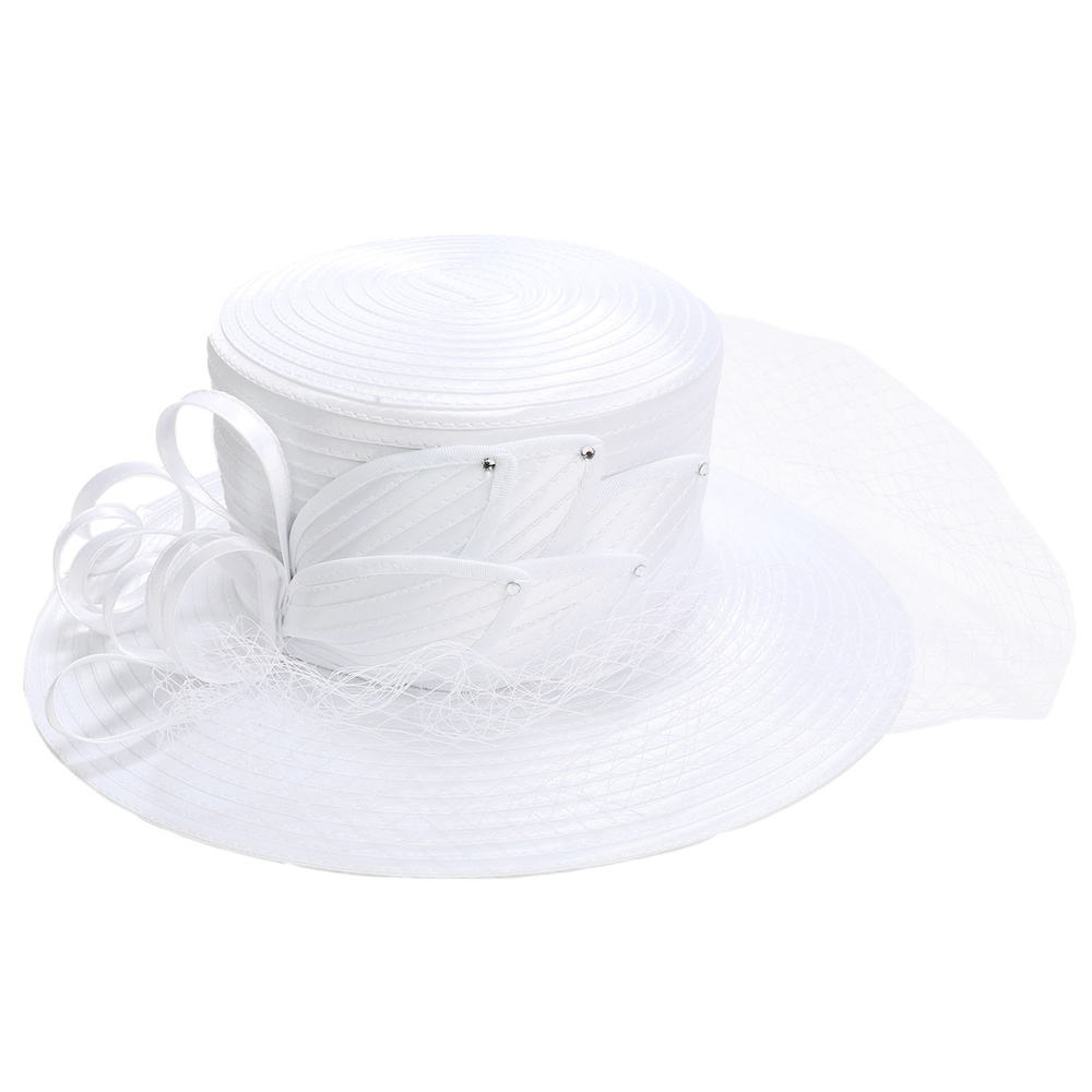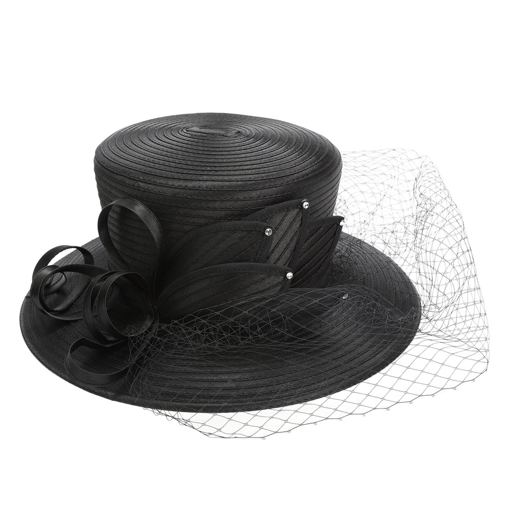 RHINESTONE STUDDED BOW NETTED PAPER BRAID DRESS HAT WITH VEIL TRIM AND RIBBON