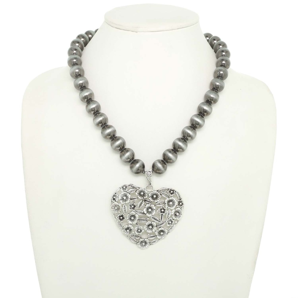 WESTERN HEART PENDANT WITH FLORAL DETAIL ON BEAD STRAND NECKLACE