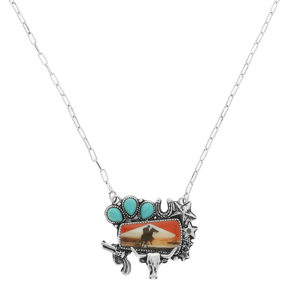 WESTERN LONGHORN NECKLACE WITH HORSESHOE STARS AND TURQUOISE ACCENTS