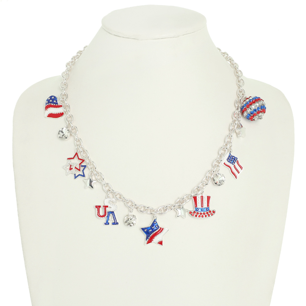MULTI CHARM NECKLACE WITH USA LETTER FLAG HEART TOP HAT STAR AND CRYSTAL CHARMS